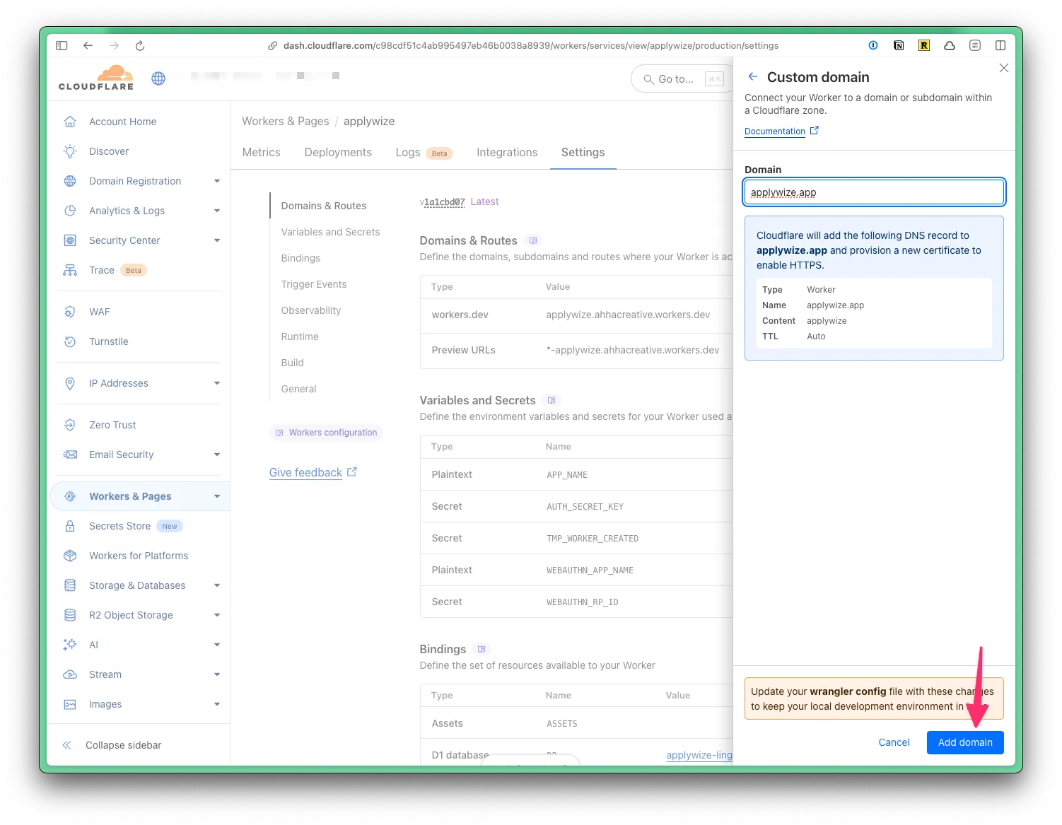 Section titled “Hooking Up your Domain Name to your Project”To use a domain name that’s registered to your Cloudflare account, go to Workers & Pages in the left side navigation. Then, click on the name of your project. Click on the Settings tab. At the top, you’ll see the domains associated with your project.